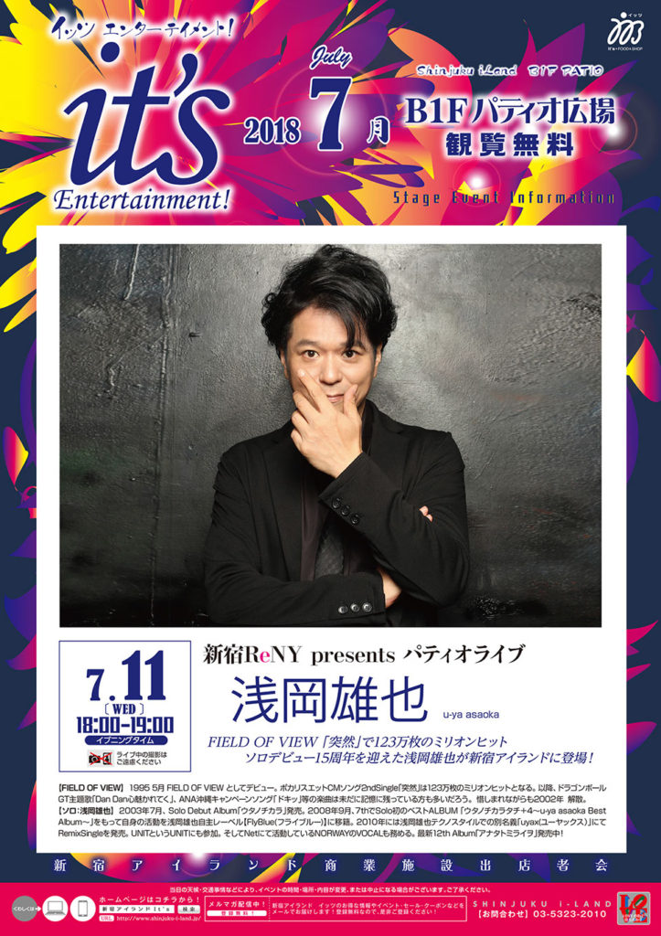 2018.07.09 Event 【新宿アイランド】7/11(水)SHINJUKU ReNY presents パティオライブ 浅岡雄也フリーLive サポートGuitar:馬場一嘉氏 7/11(水)【新宿アイランド】 18:00~19:00を予定しております。 B1Fパティオ広場にて、観覧無料です。 物販ございます。 どうぞご来場ください!