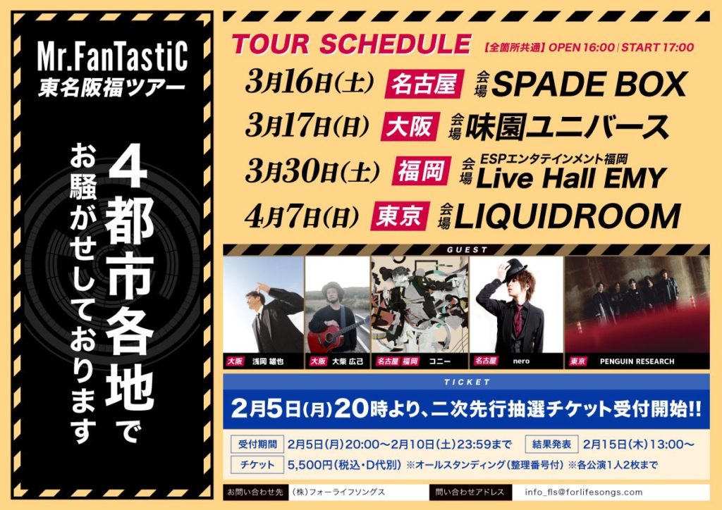 2024.02.05 Event 3/17(日)Mr.FantastiC「東名阪福ツアー」大阪ゲスト決定! チケット2次先行抽選スタートだ! https://eplus.jp/mrftc/ (2/10 23:59まで)